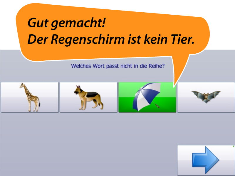 der Sprachcomputer gibt das entsprechende Wort oder Aussage über die Sprachausgabe laut aus. Auf diese Weise lassen sich über eine Grammatikfunktion